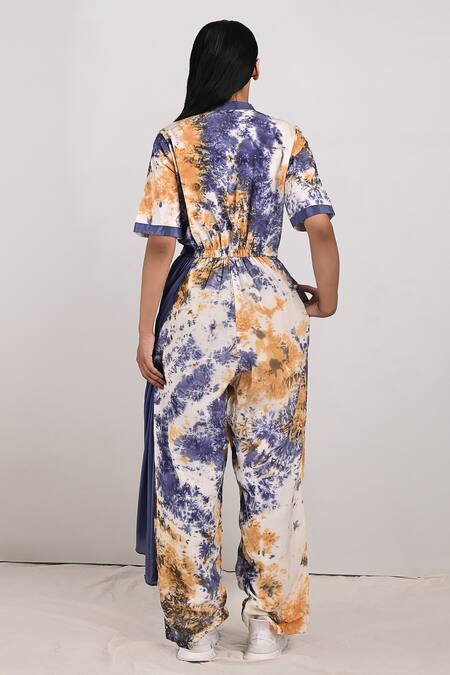 Cream jumpsuit saree with tie & dye print, asymmetric overlay & mandarin neckline.