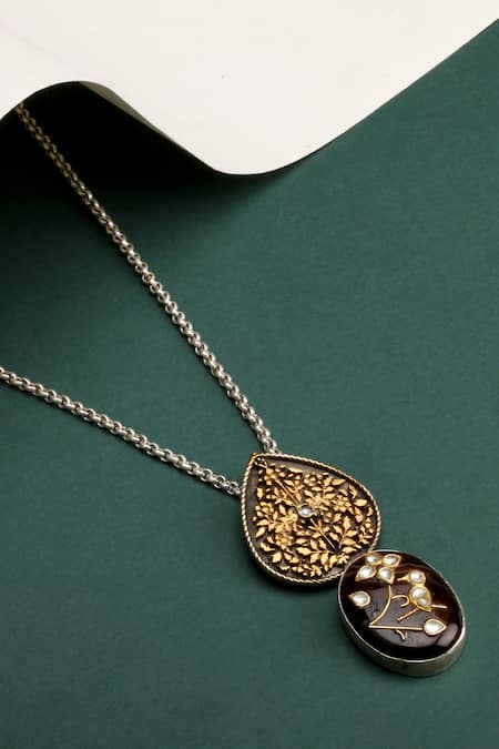 Gold toned carved pendant necklace featuring intricate designs and embellished with black labradorite and kundan stones