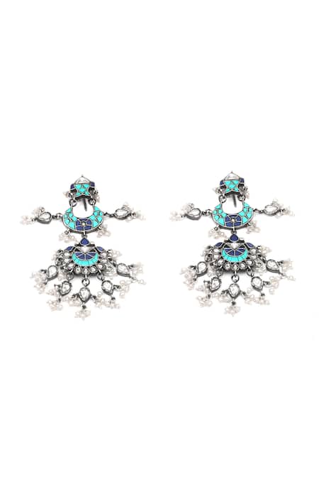 Silver dangler earrings featuring pearl drops, turquoise stones, and kundan embellishments