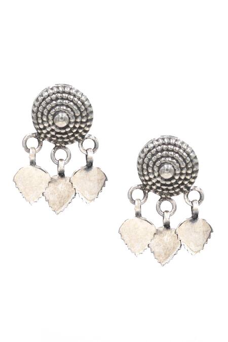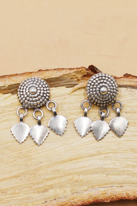 Silver Plated Cut Work Bullian Leaf Oxidised Carved Drop Earrings