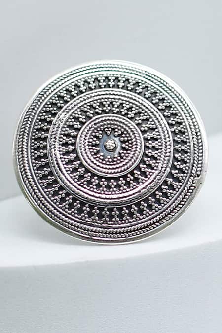 Silver toned oxidized ring featuring intricate rawa work floral carvings