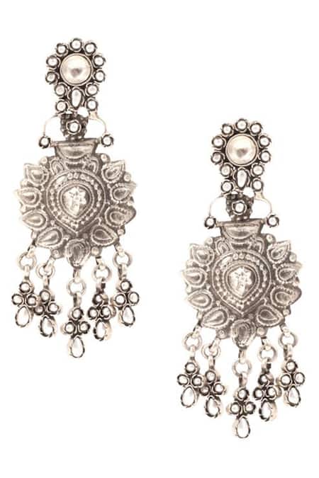 Silver dangler earrings featuring carved floral motifs and stone drops