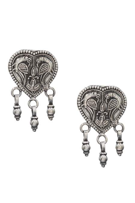 Silver Plated Cut Work Carved Parrot Oxidised Drop Earrings