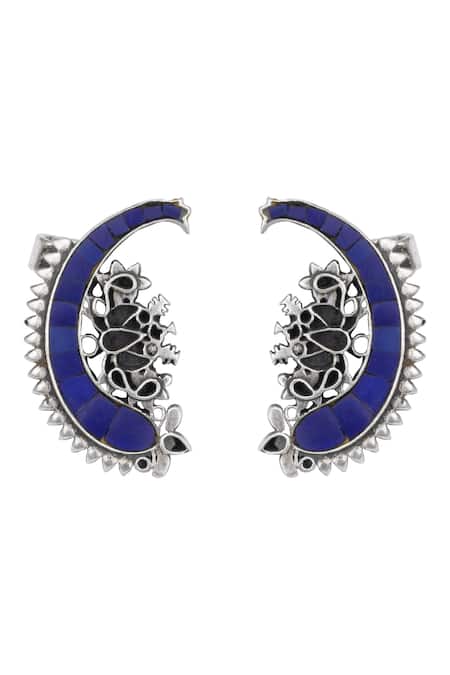 Silver ear cuffs featuring carved details and studded with kundan