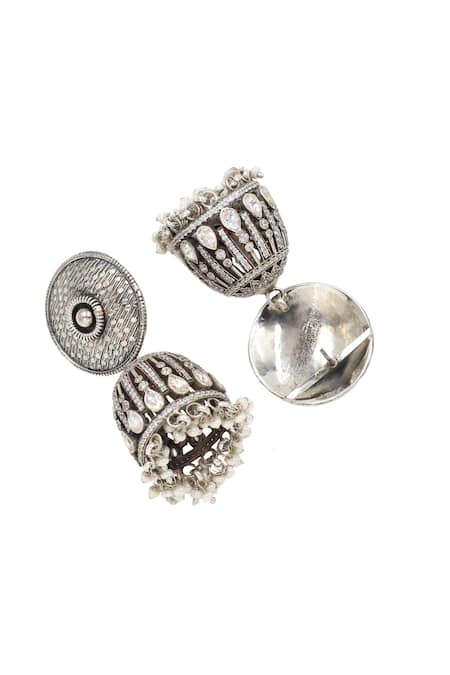 Silver earrings featuring intricate moissanite work and dangling embellishments.