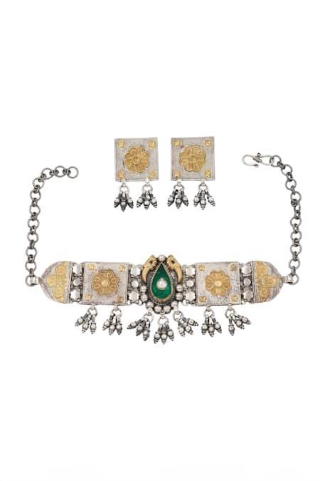 Silver choker featuring floral and parrot carved motifs with a tear-drop emerald stone pendant. Paired with matching dangler earrings adorned with similar motifs.