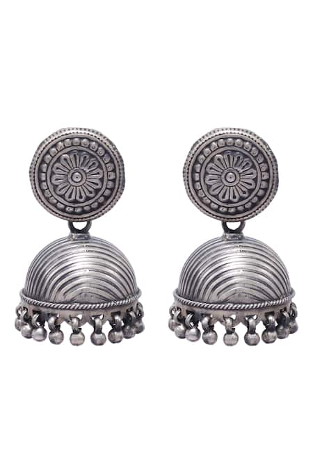 Silver toned oxidized dome shaped jhumkas featuring floral filigree carved tops