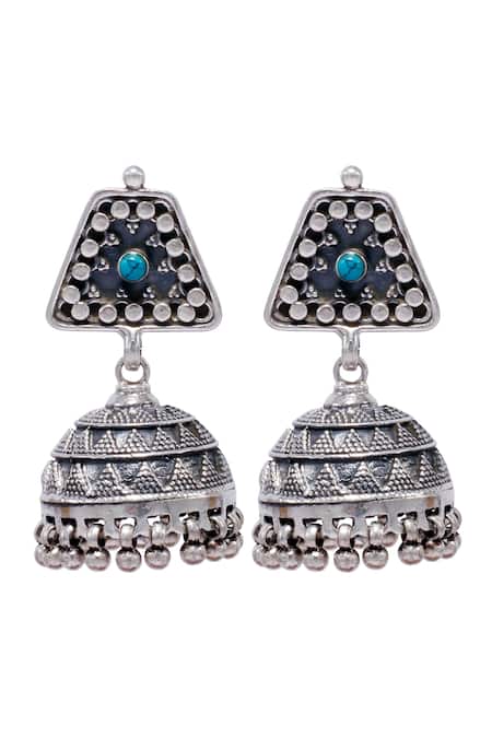 Silver toned oxidized jhumkas featuring a geometric firoza stone embellished top and rawa work drop