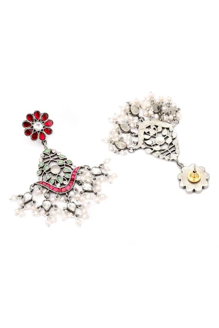 Multi color chandelier earrings featuring floral carvings with kundan and bead embellishments