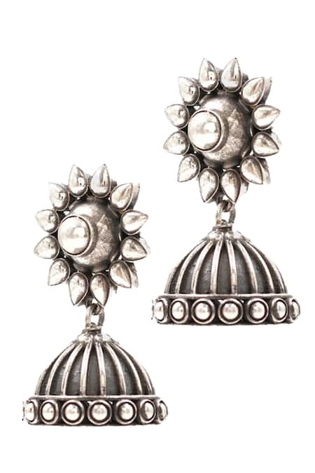 Silver jhumkas featuring floral carved detailing with a push back clasp