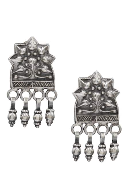 Silver Plated Cut Work Floral Carved Oxidised Earrings
