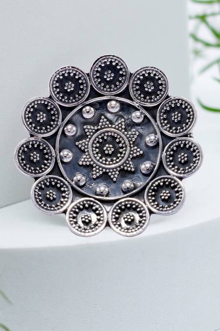 Intricate floral carvings, Oxidized finish, Adjustable band