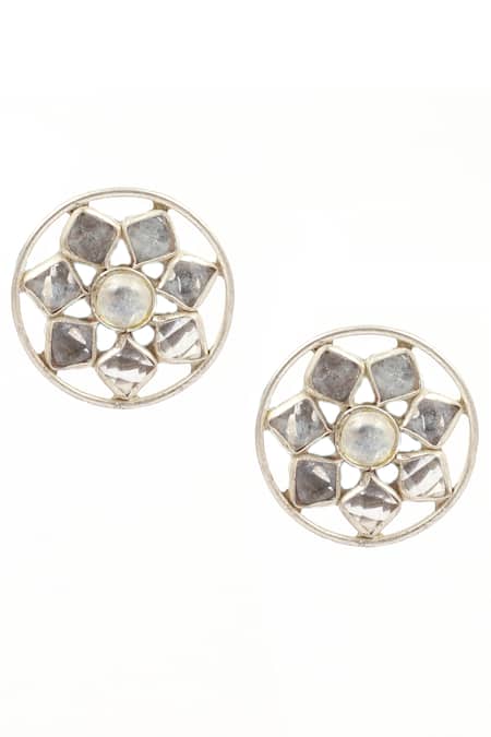 Silver toned stud earrings featuring floral cut-out designs and stone embellishments