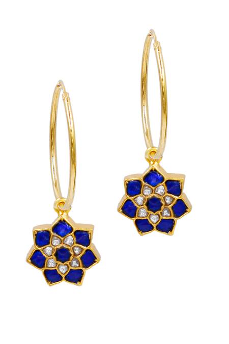 Gold polished hoops featuring blue stone embellished floral drops