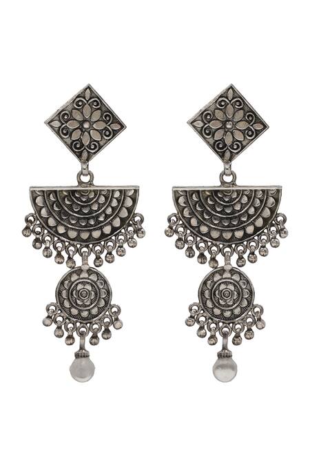 Silver Plated Geometric Floral Carved Ghunghroo Earrings