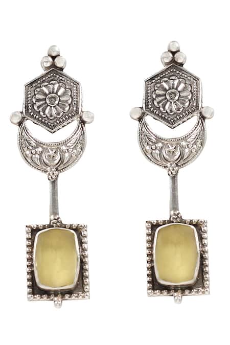 Sterling silver geometric earrings featuring carved floral patterns and yellow stone embellishments