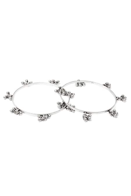 Silver bracelets featuring ghungroo drops for a traditional touch. This set includes two handcrafted bracelets designed for a standard fit.