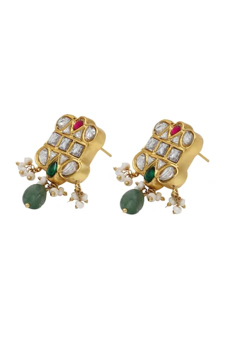 Gold plated earrings featuring abstract cutwork design with jadau kundan and multi color stone embellishments