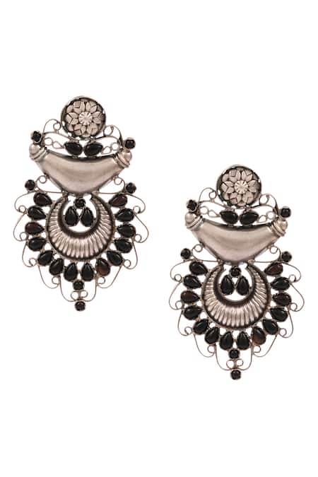 Silver toned chandbalis featuring a floral top and intricate carved details