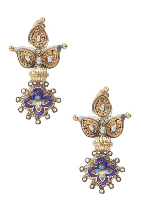 Silver earrings featuring enamel detailing with paisley carved motifs and cutwork detailing