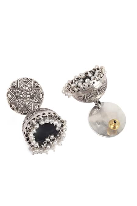 Silver jhumkas featuring intricate carvings and pearl drops