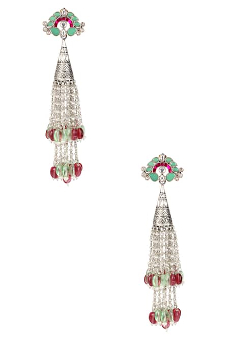 Silver long jhumkas featuring carved details and studded kundan