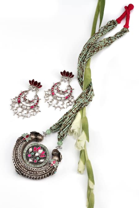 Silver stone embellished long necklace featuring carved pendant and beaded multi-strands. Paired with matching dangler earrings.