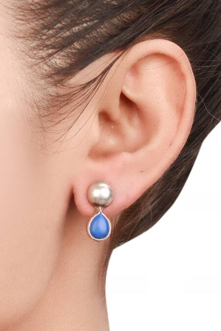 Silver teardrop stud earrings featuring encrusted blue gemstone