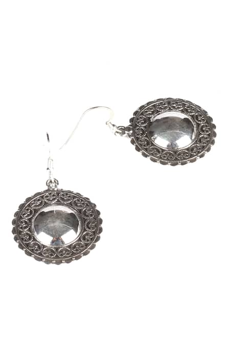 Silver handmade danglers featuring a scallop border and circular motif drop
