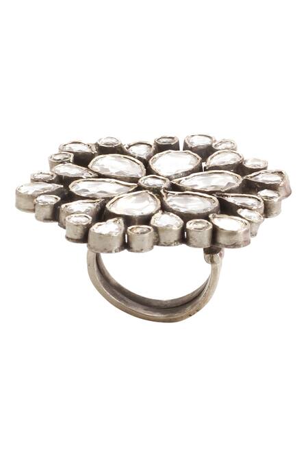 Silver Plated Imitation Diamonds Handmade Kundan Floral Ring