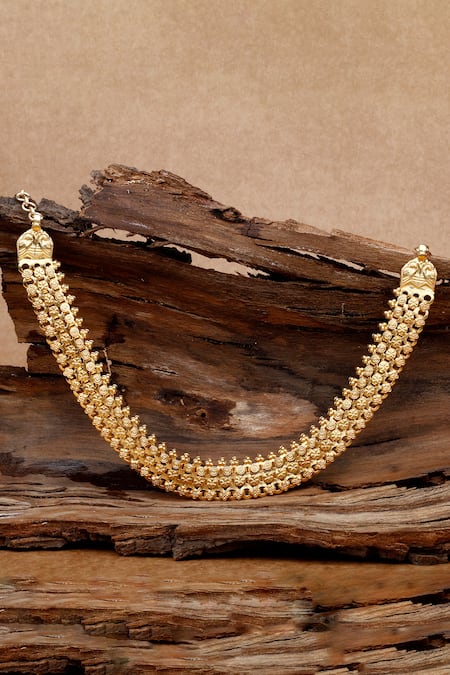 Gold necklace featuring multiple layered chains and tribal cut work design