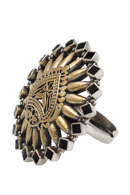 Black Kundan ring featuring a floral cutwork design with jadau embellishments