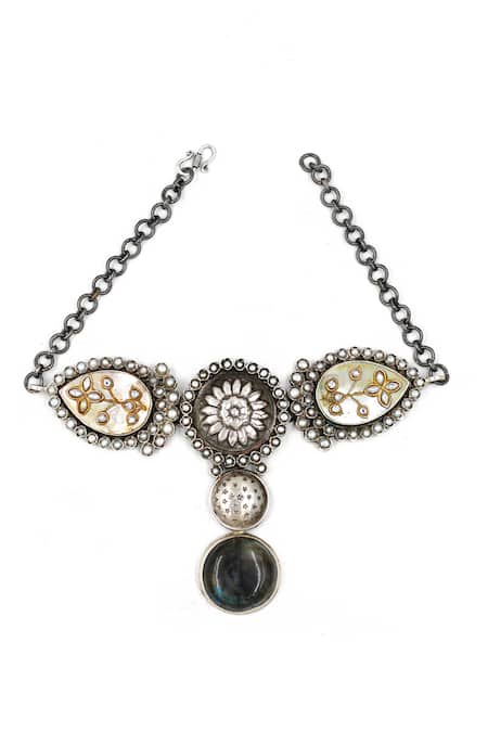 Silver pendant necklace featuring leaf carved detailing and stone embellishment