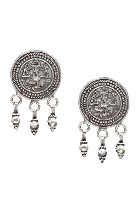 Silver Plated Lord Ganesha Oxidised Carved Drop Earrings
