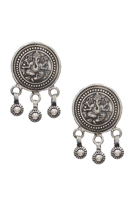 Silver toned oxidised drop earrings featuring carved depictions of Lord Ganesha