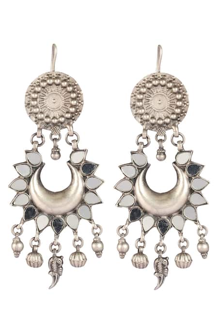 Silver toned handmade earrings featuring a lunar crescent shape design with glass stone embellishments. The earrings have a unique floral motif at the top with dangling details.