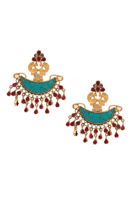Gold toned chandbalis featuring a carved peacock motif with stone drops