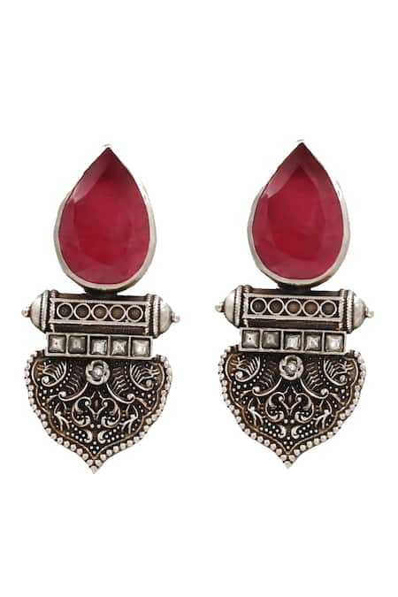 Red dangler earrings featuring onyx stone and intricate silver detailing