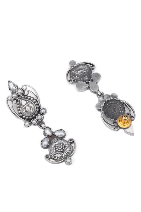 Silver dangler earrings featuring floral carved motifs with pearl embellishments