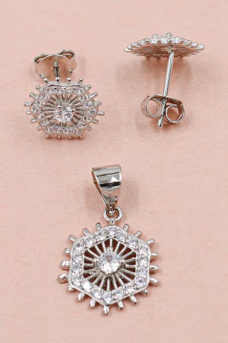 Silver spiral geometric cutwork studs adorned with cubic zirconia embellishments. Accompanied by a matching pendant that does not include a chain.