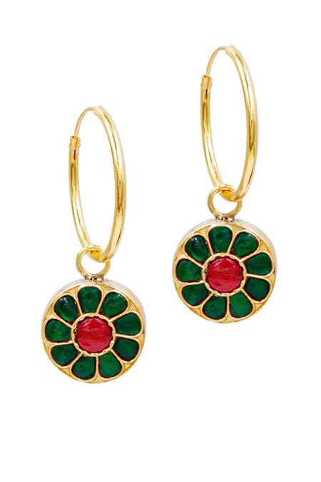 Circular drop design with floral motif, Stone embellishments in green and red, Lightweight design for comfortable wear