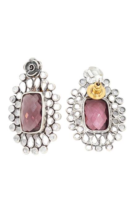 Silver toned geometric shaped earrings featuring pink hydro stone embellishments