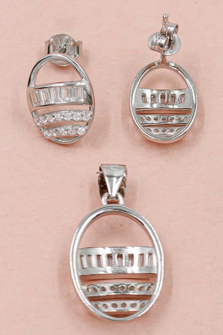 Silver tone oval shape pendant studded with round and rectangular clear cubic zirconia stones. Paired with matching earrings featuring the same studded design.