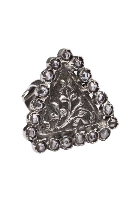 Silver toned triangle shaped ring featuring a floral carved pattern and stone embellishment