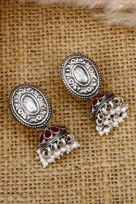 Silver Plated Pearls, Stones Tribal Oval Shaped Jhumkis