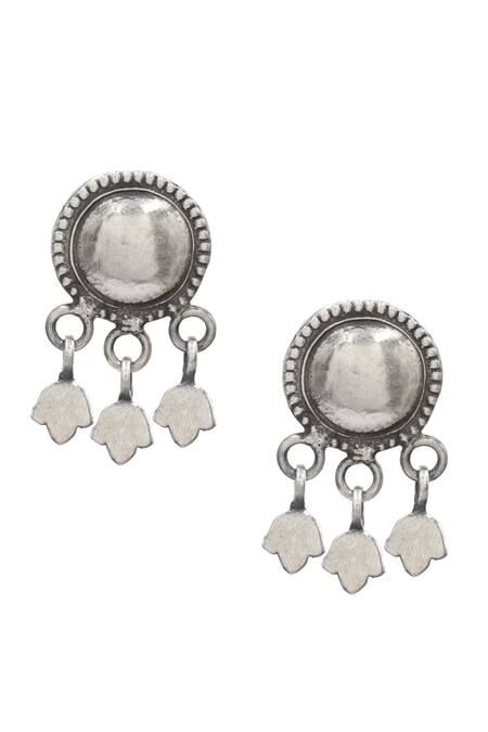Silver toned tribal pattern oxidised dangler earrings featuring a circular shape with three hanging elements