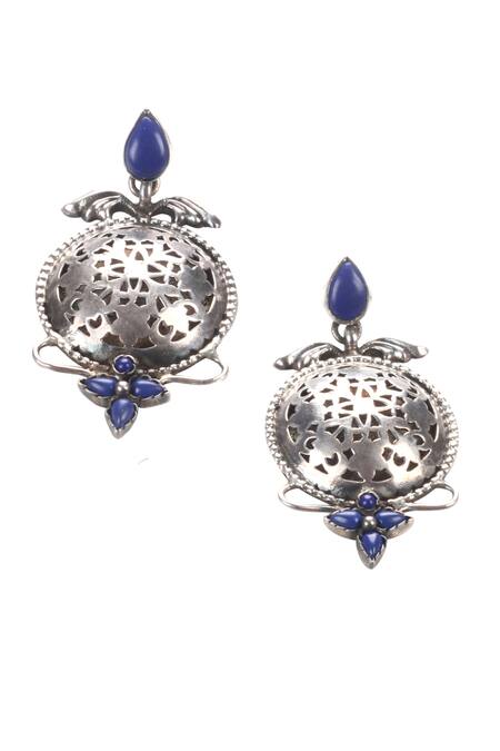 Handcrafted silver earrings featuring vintage cut work with blue stone embellishments