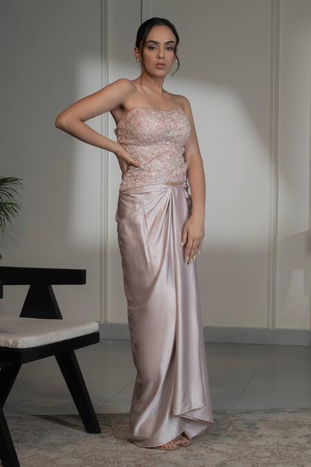 Pink corset featuring a sweetheart neckline embellished with tonal sequins and French knots. Paired with a draped satin skirt that flows elegantly.
