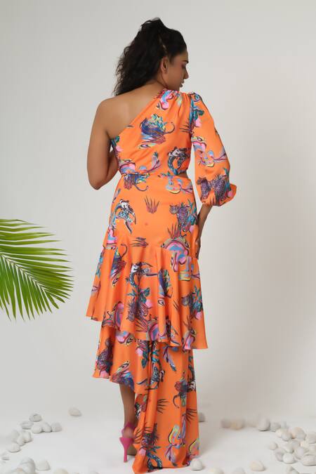 Orange Satin Silk Print Animateness One Shoulder Neck Ruffle Pleated Dress