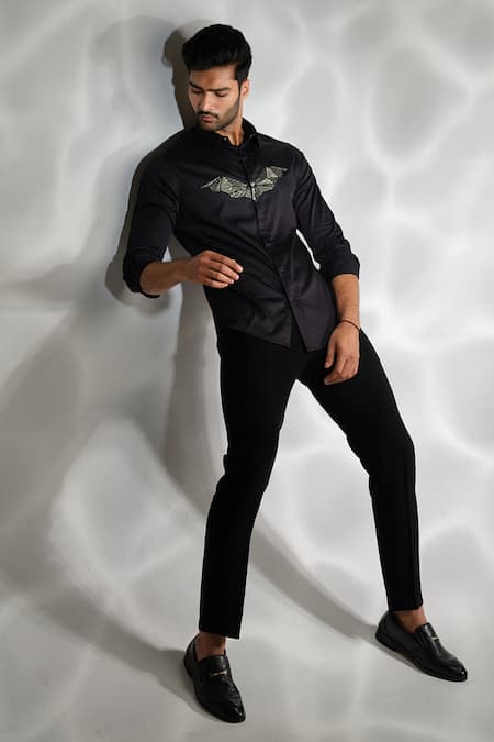 Black cotton shirt featuring gunmetal cutdana hand embroidery in bat design